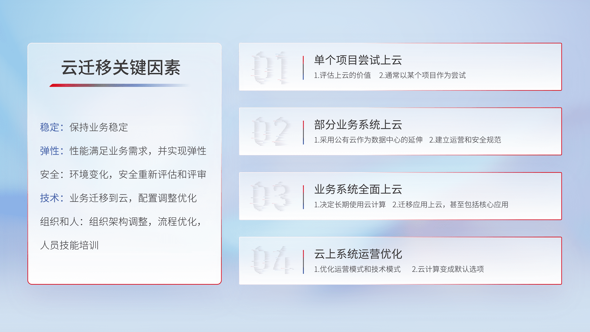 结合实际业务,,,从规划设计、、云平台选型、、、、云原生改造、、、数据迁移、、、集成交付,,,迁移全过程为客户识别最佳上云路径,,,,做好风险识别管理,,,设计网络架构、、、、身份权限、、、安全审计合规、、、操作审计、、日志审计、、、监控告警策略、、、、多站点容灾设计等,,对云上基础设施进行整体规划,,,提升IT治理水平,,,以满足弹性、、、、高可用、、高性能的需求。。。