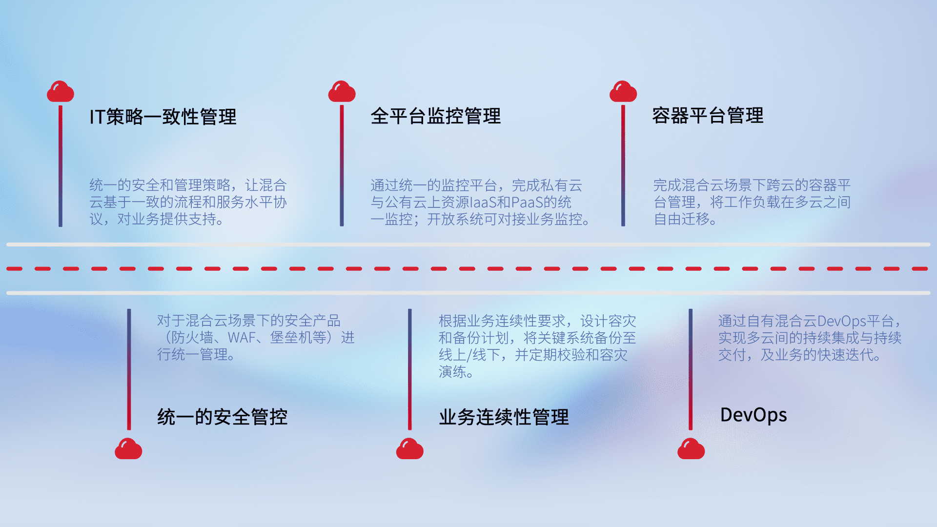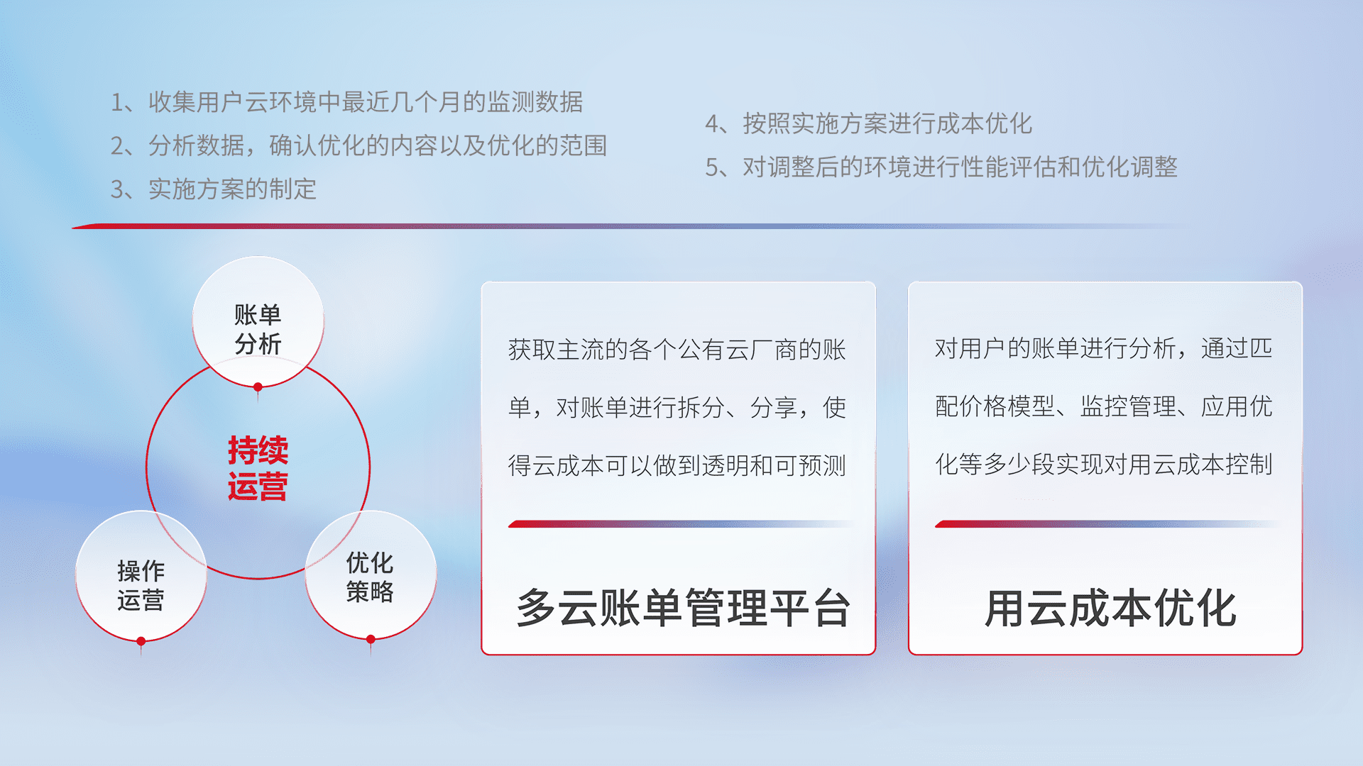 通过多云纳管,,以统一的资源数据模型把客户的云资源进行抽象和封装,,,进而实现对多云资源的统一操作,,,,保障云资源管理的可靠性、、稳定性与可用性。。。量身定制化运维内容,,,,配置、、、开发运维、、、补丁管理、、备份、、、、监控、、、认证和访问管理、、、、审计和日常巡检等,,,,保障在用云过程中的可靠度,,稳定度以及高可用率。。。
